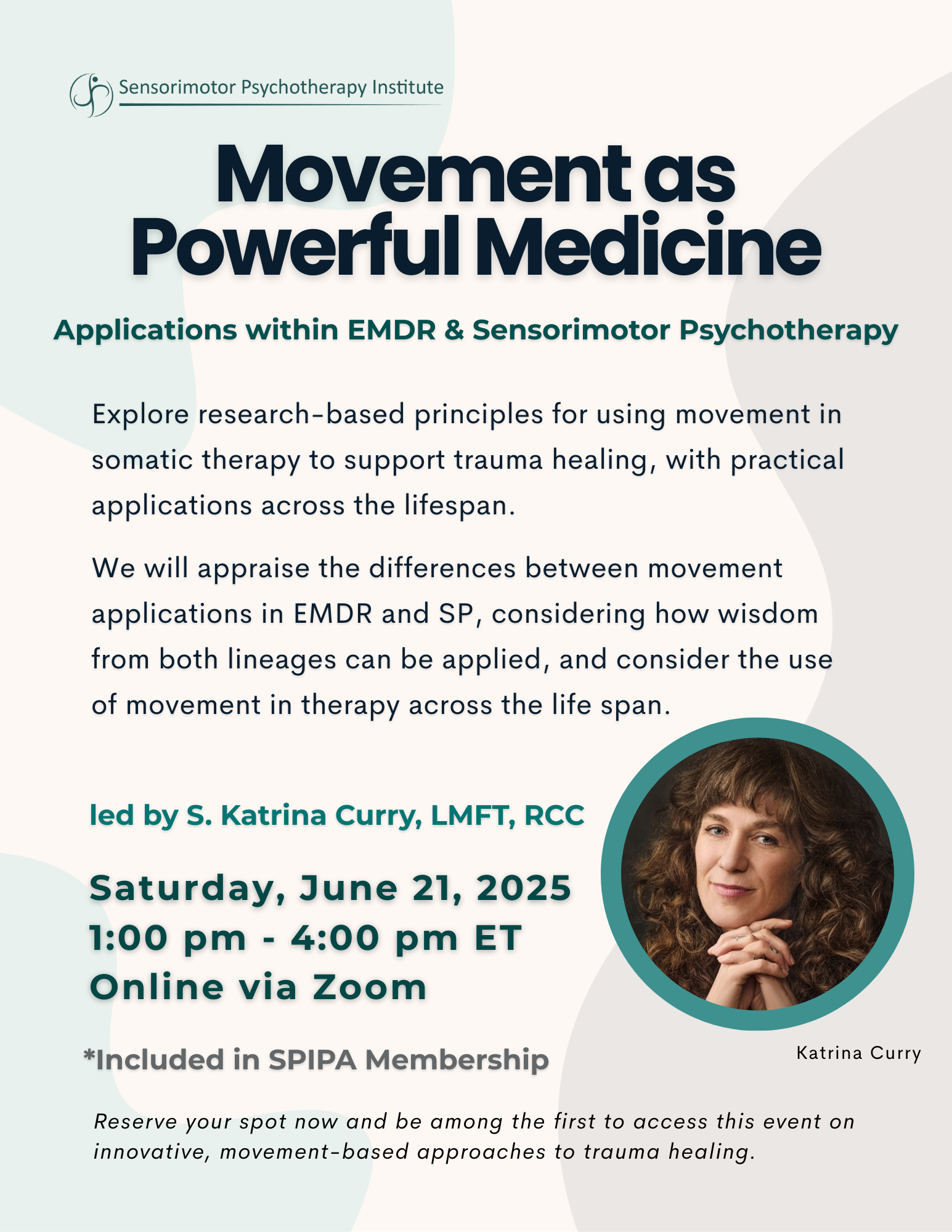 We hope you’ll join us for this live dynamic and grounding session with SP Trainer, Katrina Curry!